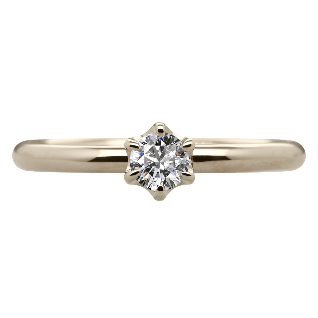 この婚約指輪は、アームは丸線のシンプルなデザインで仕上げ、6本爪の王道デザインは、どんなシーンにも合わせやすく、長く愛用していただけます。