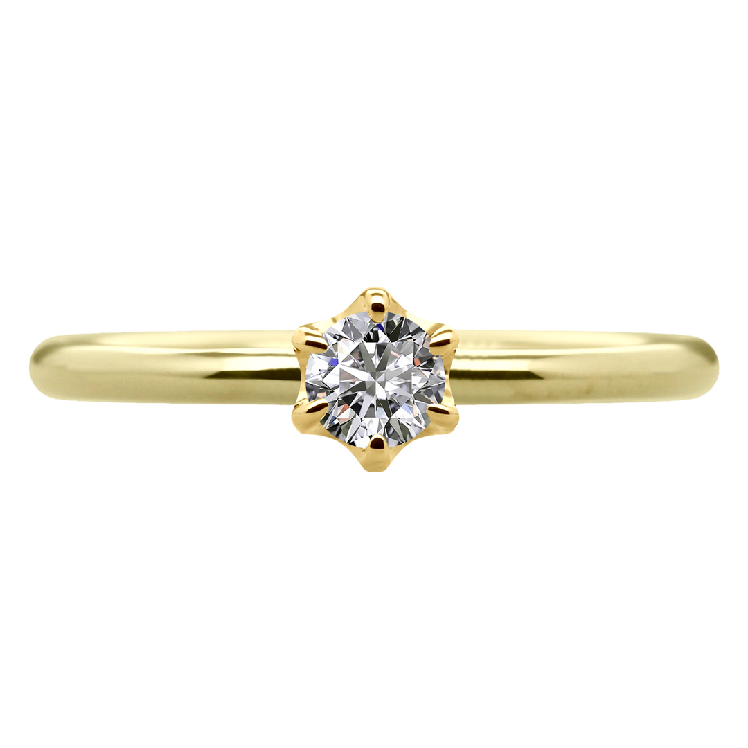 この婚約指輪は、ふたつの地金素材を組み合わせシンプルで美しい丸形状のアームを採用し、シンプルながらも華やかな印象を与えます。6本爪の王道デザインは、どんなシーンにも合わせやすく、長く愛用していただけます。