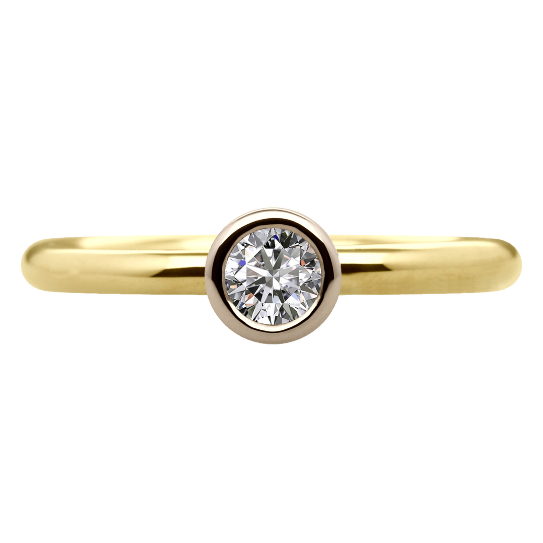 この指輪のリングアームは丸型状に作られているため指に優しくフィットする着け心地で、椿の花をイメージしたシンプルでエレガントなフクリンデザインが特徴で、ダイヤを包み込む優しいカーブは椿の花びらを模しています。ふたつの地金素材の組み合わせにより、指輪に奥行きと美しいコントラストが生まれ、上品で温かみのある印象を与えます。