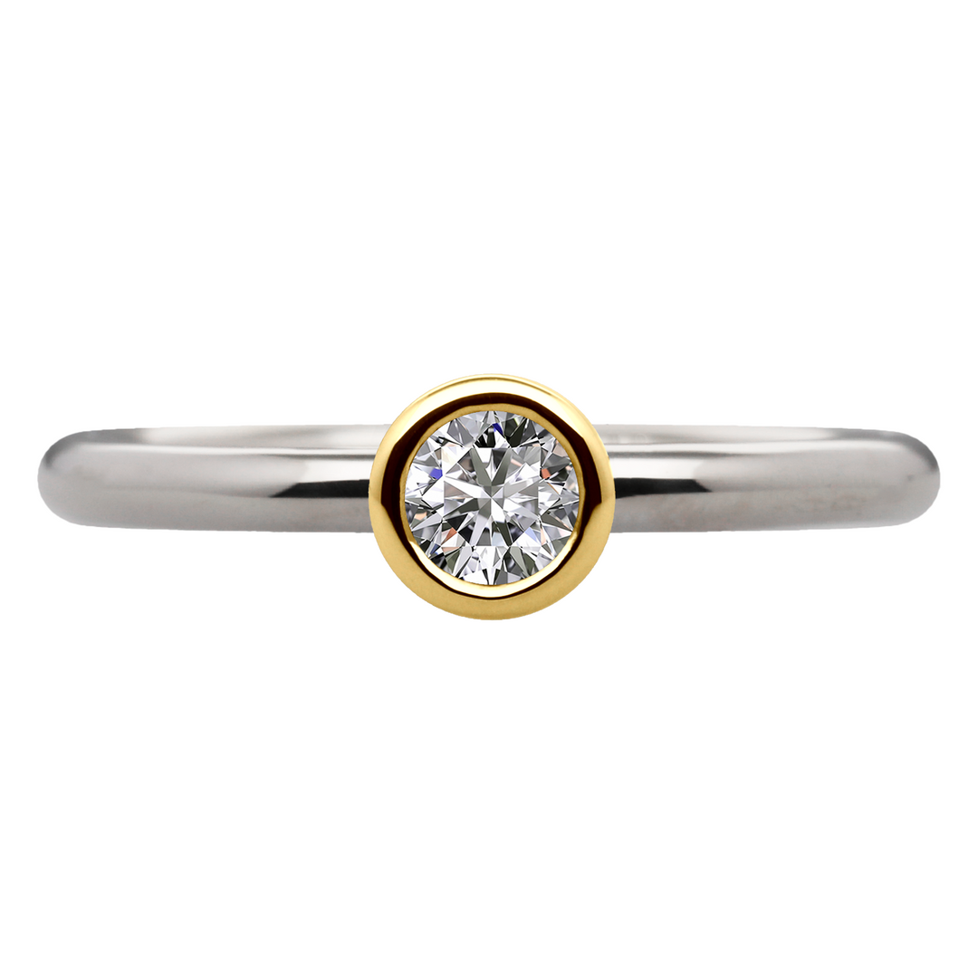 この指輪のリングアームは丸型状に作られているため指に優しくフィットする着け心地で、椿の花をイメージしたシンプルでエレガントなフクリンデザインが特徴で、ダイヤを包み込む優しいカーブは椿の花びらを模しています。ふたつの地金素材の組み合わせにより、指輪に奥行きと美しいコントラストが生まれ、上品で温かみのある印象を与えます。