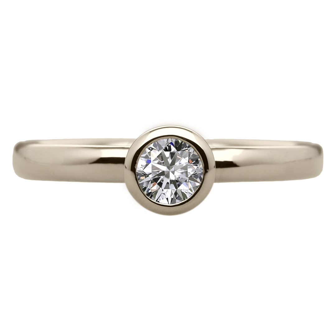 この婚約指輪は、椿の花をイメージしたシンプルでエレガントなフクリンデザイン。ダイヤを包み込む優しいカーブは、椿の花びらを模しており、上品で温かみのある印象を与えます。