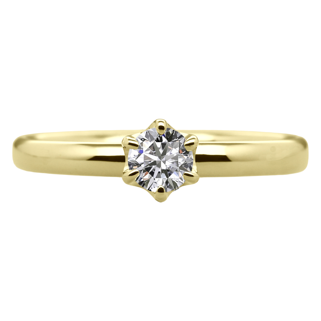 この婚約指輪はアームは甲丸のシンプルで優雅なデザインで着け心地良く、6本爪の王道デザインは、どんなシーンにも合わせやすくシンプルながらも華やかな印象を与え、長く愛用していただけます。
