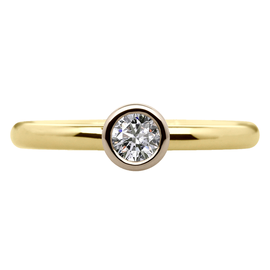 この指輪は、ふたつの地金素材を組み合わせた婚約指輪です。椿の花をイメージしたシンプルでエレガントなフクリンデザインが特徴で、ダイヤを包み込む優しいカーブは椿の花びらを模しています。地金素材の組み合わせにより、指輪に奥行きと美しいコントラストが生まれ、上品で温かみのある印象を与えます。