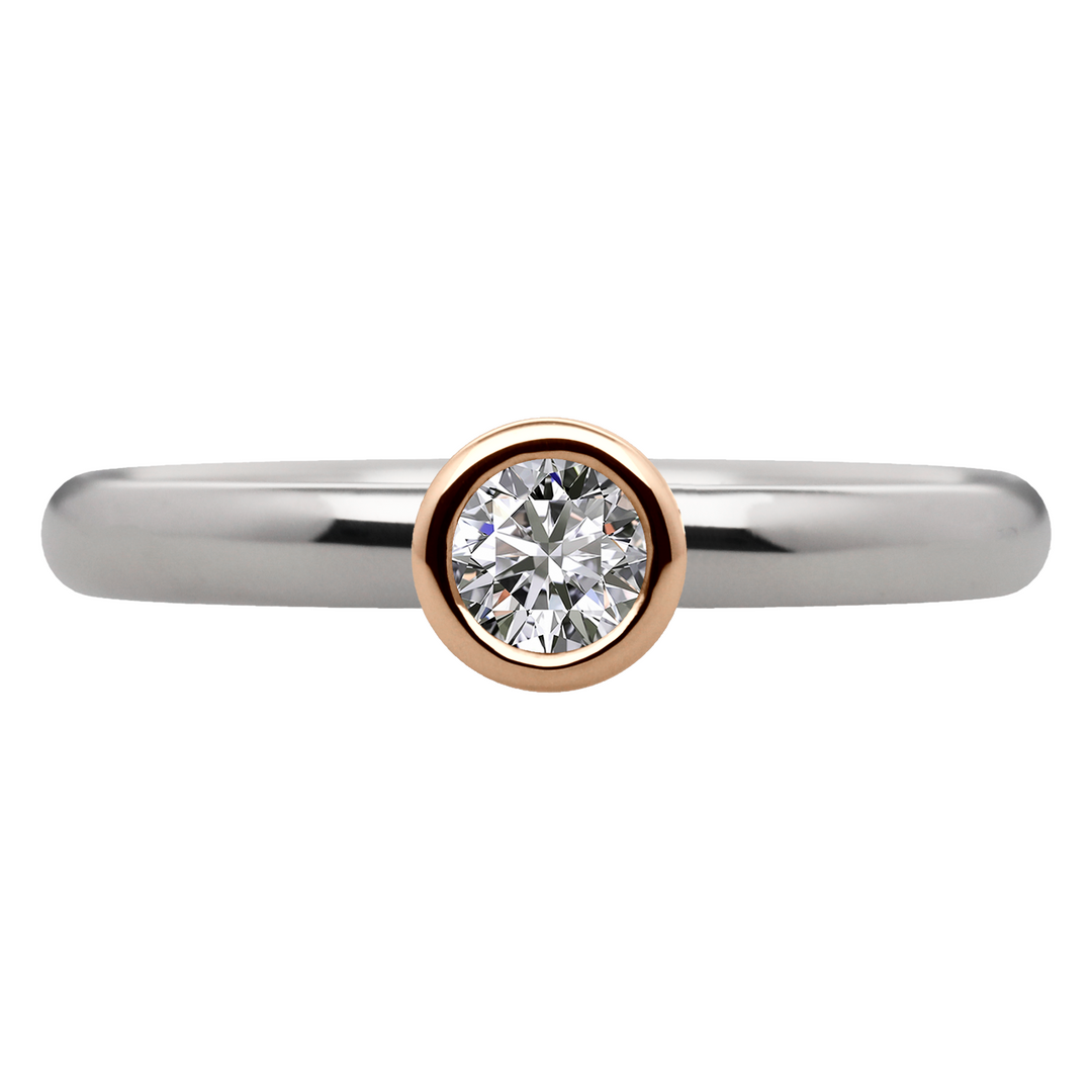 この指輪は、ふたつの地金素材を組み合わせた婚約指輪です。椿の花をイメージしたシンプルでエレガントなフクリンデザインが特徴で、ダイヤを包み込む優しいカーブは椿の花びらを模しています。地金素材の組み合わせにより、指輪に奥行きと美しいコントラストが生まれ、上品で温かみのある印象を与えます。