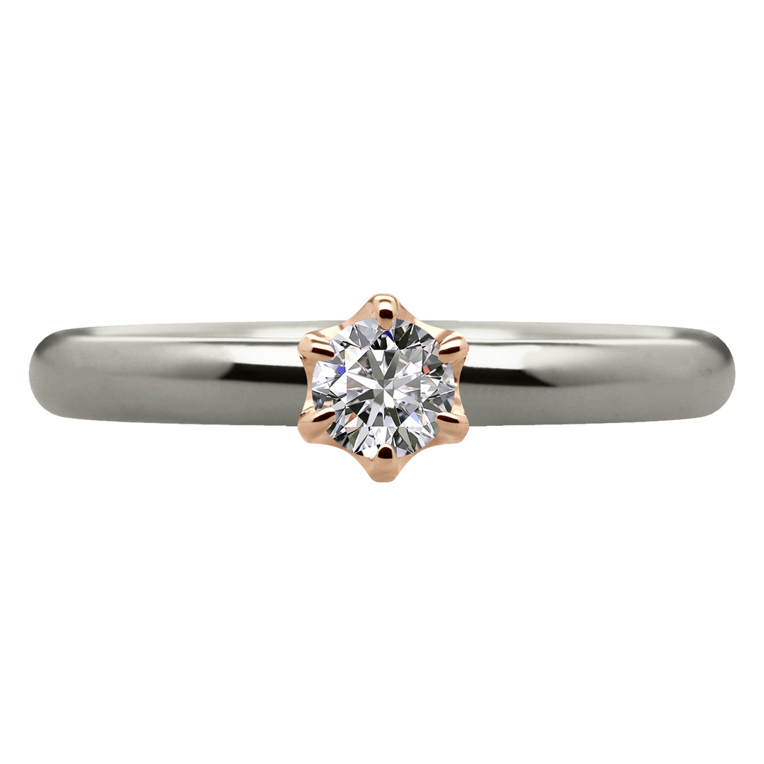 この婚約指輪は、ふたつの地金素材を組み合わせて、シンプルながらも華やかな印象を与えます。6本爪の王道デザインは、どんなシーンにも合わせやすく、長く愛用していただけます。
