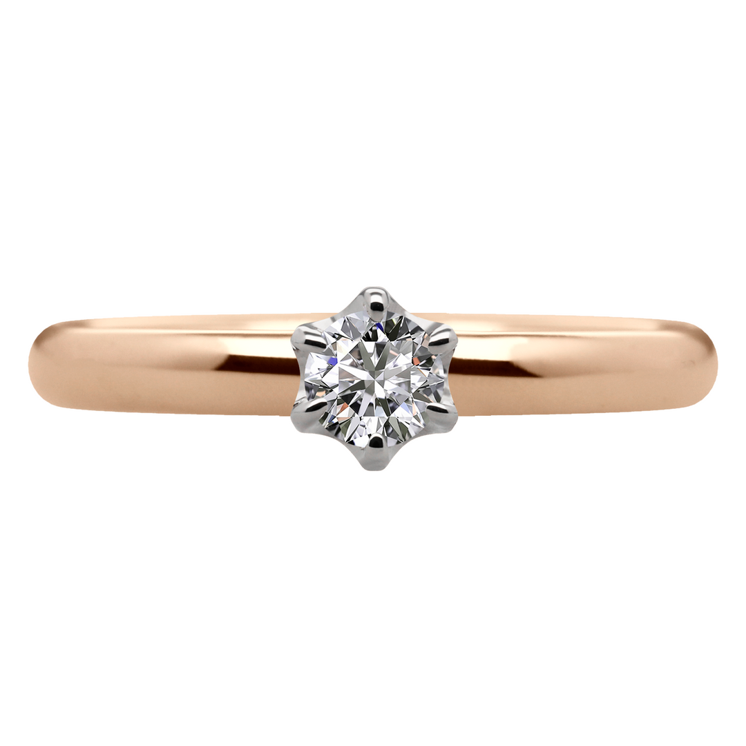 この婚約指輪は、ふたつの地金素材を組み合わせて、シンプルながらも華やかな印象を与えます。6本爪の王道デザインは、どんなシーンにも合わせやすく、長く愛用していただけます。