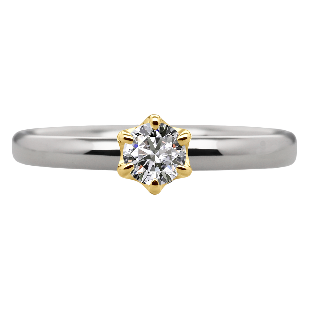 この婚約指輪は、ふたつの地金素材を組み合わせて、シンプルながらも華やかな印象を与えます。6本爪の王道デザインは、どんなシーンにも合わせやすく、長く愛用していただけます。
