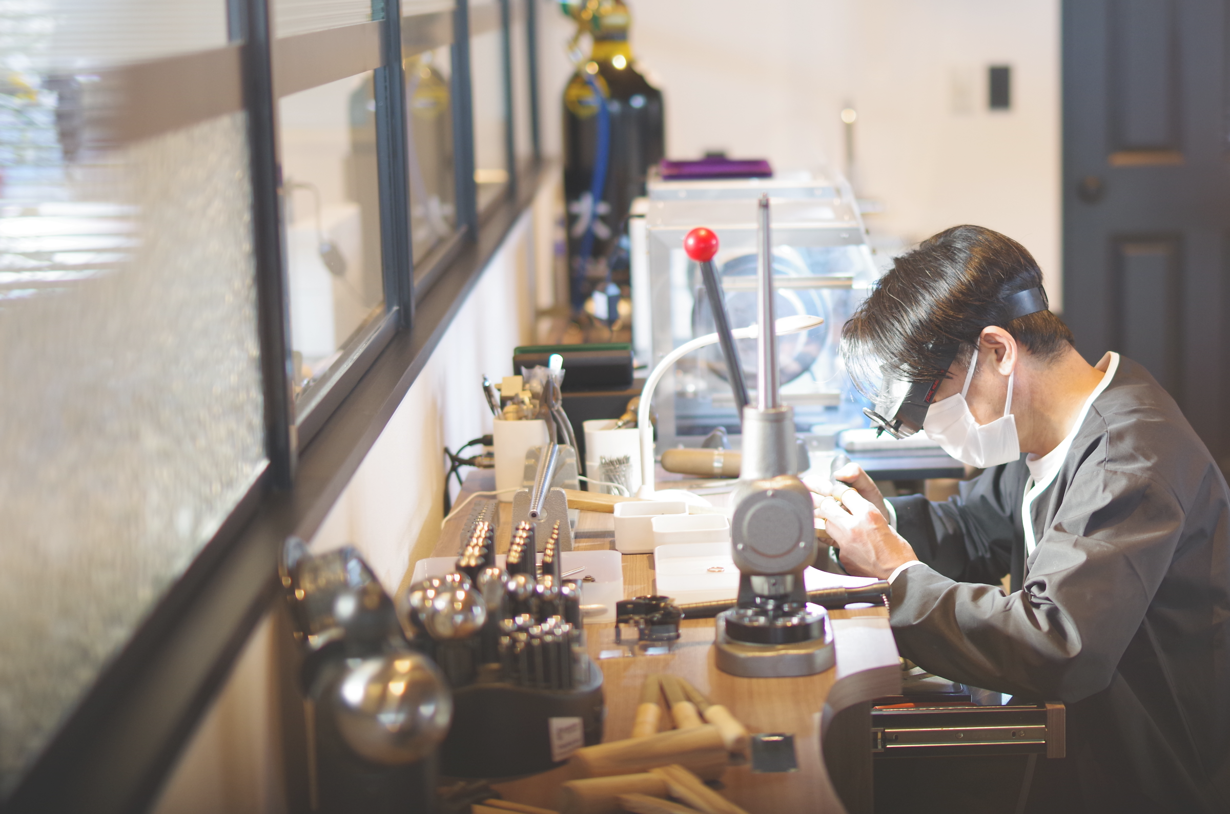 鍛造製法は先にもお伝えした通り、金属に圧力を加えて成型していくため、金属の中の空気が抜けるため、指に吸い付くような着け心地を感じていただけます。